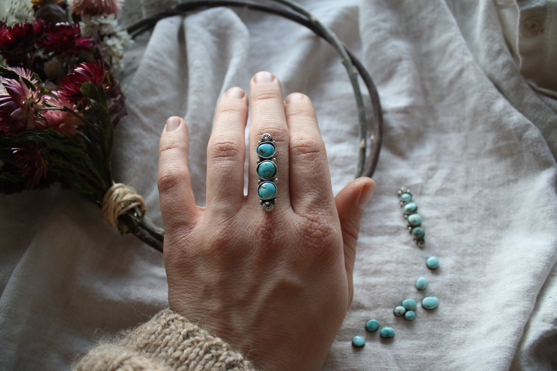 4 pieces of high grade Dry Creek turquoise set in all silver, with some accents. Finished as a double banded ring, in your size. Photo feautes double ring band.