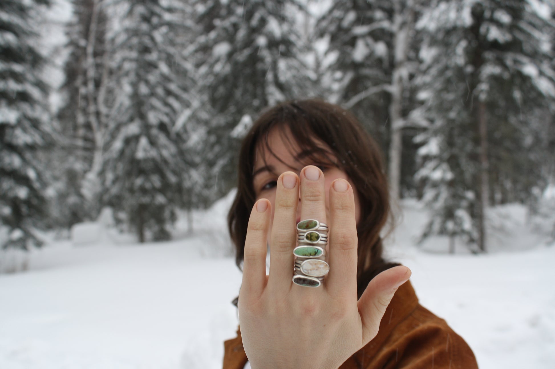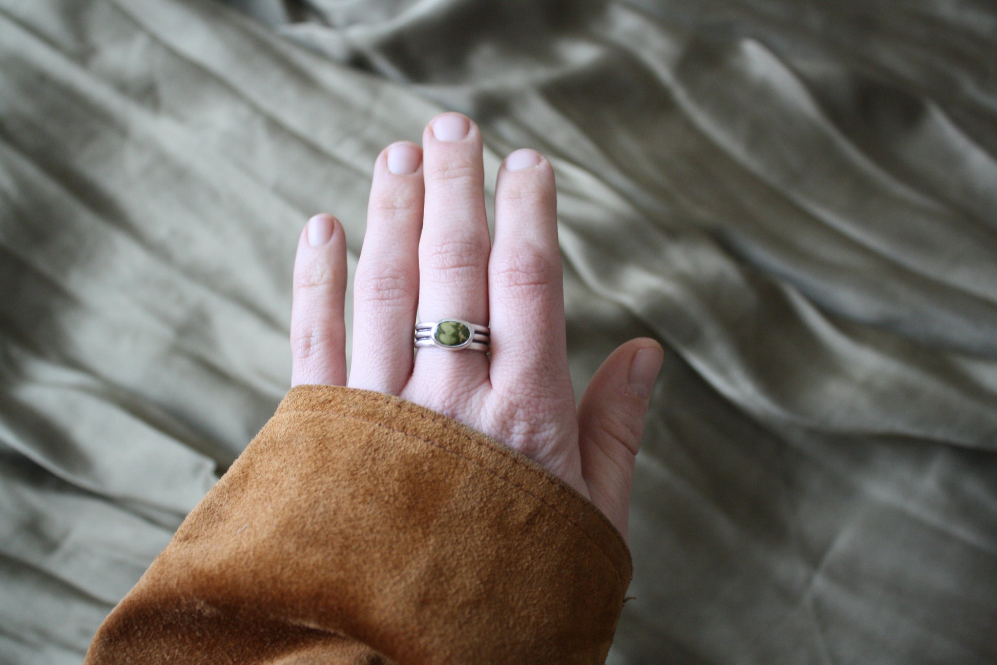 A beautiful piece of emerald valley turquoise set in a thick bezel atop a sturdy triple silver band. Size 6.5. Durable piece made for everyday wear.