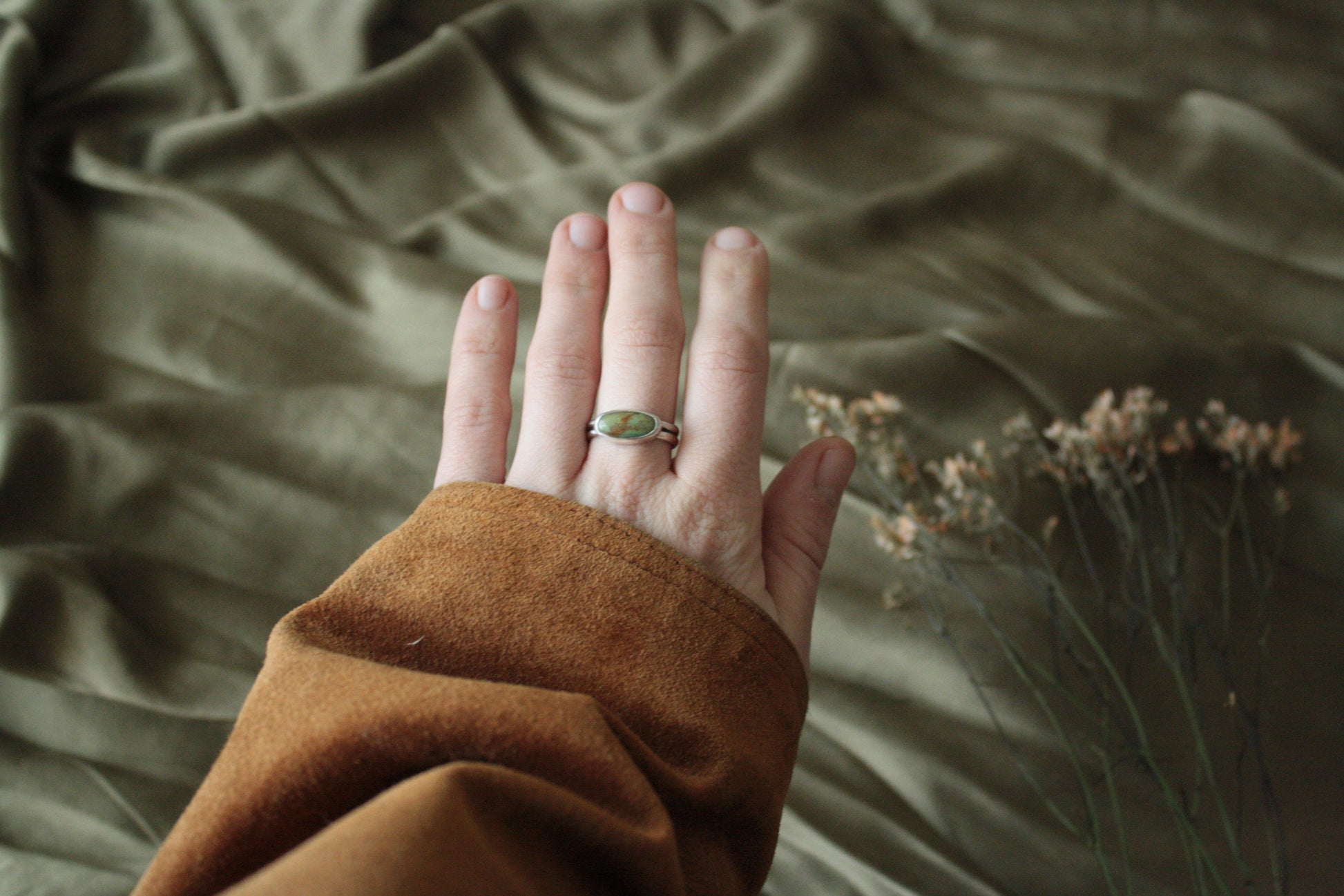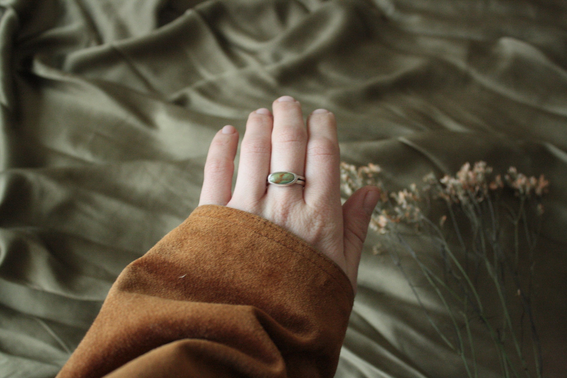 Kingman Turquoise ring. Set in all sterling silver on top of a comfortable double band. Size 8.25. Finished with a light shine.